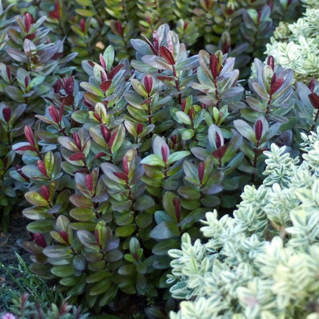 Les Hebe à grandes feuilles se distinguent par des épis de fleurs spectaculaires naissant au-dessus du feuillage, dans l’axe des feuilles, comme chez Hebe ‘Wiri Charm‘ ou ‘Blue Gem‘. Les Hebe à petites feuilles ont des formes compactes, une floraison plutôt discrète et une coloration intéressante du feuillage à utiliser sans modération pour structurer un massif ou un jardin moderne aux formes épurées. Certaines variétés nous gratifient d’une jolie floraison en plus d’un feuillage exceptionnel comme l’Hebe ‘Heartbreaker’ dont le feuillage lumineux vert pourpre panaché de crème en été vire progressivement au pourpre marginé de rose avec le froid.