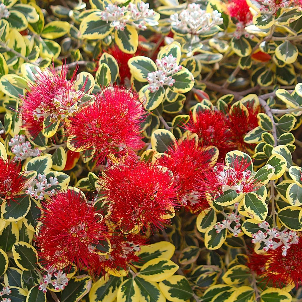 Metrosideros kermadecensis Sunninghill est un grand arbuste persistant pour climats doux. Les feuilles vertes maculĂ©es de jaune de cette variĂ©tĂ© de MetrosidĂ©ros de Kermadec sont dĂ©coratives en toutes saisons, et sa floraison en plumeaux rouge vif est magnifique tout l’Ă©tĂ©. Ses exigences sont aussi exotiques que son aspect car il ne tolère que des gels lĂ©gers, ce qui le cantonne aux jardins de bord de mer et du sud… Dans les zones plus fraĂ®ches, sa croissance lente permet de le planter en bac pour pouvoir le rentrer en hiver. Il aime les sols riches neutres Ă acides, frais mais bien drainĂ©s et supporte aussi le sec une fois bien implantĂ©.