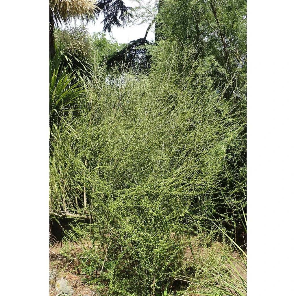 L’Olearia virgata n’est certes pas le plus spectaculaire du genre, mais la finesse de sa ramure et de son feuillage, tissant en peu d’années une masse dense et dressée de couleur vert-gris, lui confèrent cet aspect singulier, à la fois austère, élégant et indomptable, qui n’appartient qu’aux plantes de littoral. Sa floraison estivale en petites pâquerettes d’un blanc-crème un peu sale est discrète, mais agréablement parfumée, et souvent entourée d’un cortège d’abeilles trop affairées à butiner pour s’occuper du jardinier. Il s’agit là de l’un des meilleurs arbustes persistants, avec son cousin l’Olearia traversii, pour constituer des écrans efficaces en bord de mer. Cet hybride est aussi l’une des plus rustiques, des plus vigoureuses et des plus tolérantes.